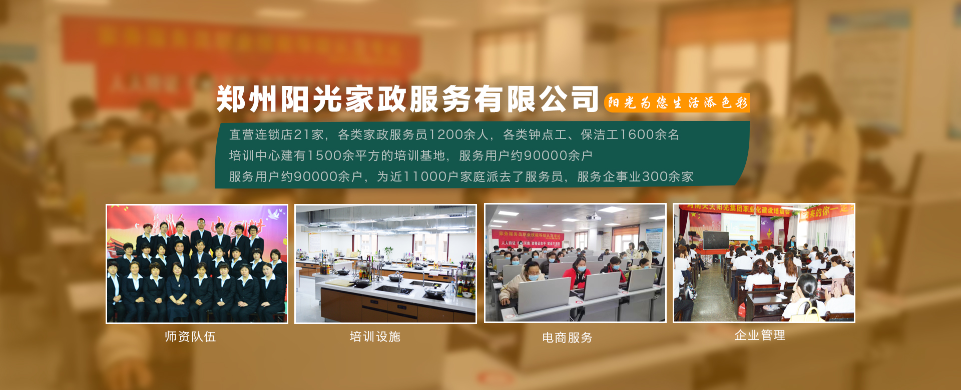 鄭州陽(yáng)光家政服務(wù)有限公司成立于1998年,是鄭州市第 一家經(jīng)工商登記的家政服務(wù)企業(yè),是以家政服務(wù)、家政培訓(xùn)、社區(qū)服務(wù)、社區(qū)養(yǎng)老、托幼護(hù)理、清洗保潔為一體的社區(qū)生活服務(wù)集成商。公司有直營(yíng)連鎖店21家,各類(lèi)家政服務(wù)員1200余人,各類(lèi)鐘點(diǎn)工、保潔工1600余名。鄭州陽(yáng)光家政商學(xué)院建有1500余平方的培訓(xùn)基地,···